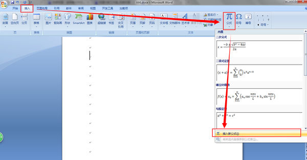 1、打开word文档,选择菜单栏的【插入】选项,点击【公式】中的【插入新公式】;