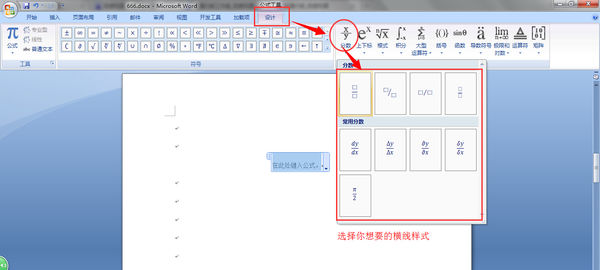 2、在弹出的【设计】选项中,选择分数,在弹出的选项中选择你要的横线样式;
