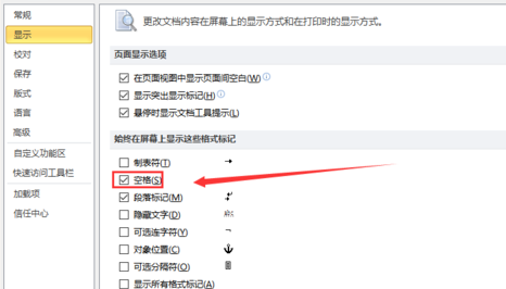 2、然后我们在弹出来的窗口中点击打钩显示中的“空格”。