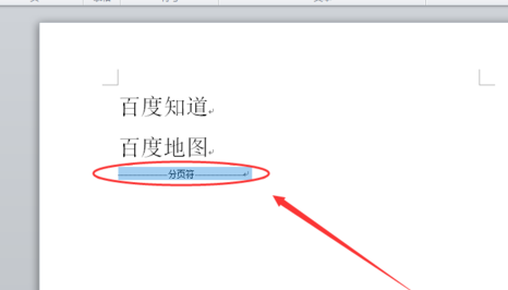 3、然后我们回到主文档,发现“分页符”字样,选中并按键盘“Delete”键即可删除分页符。