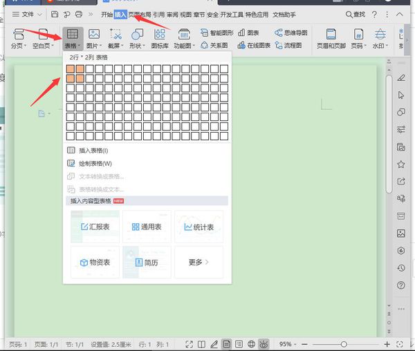 2、接下来在页面上方工具栏中选择红色箭头所指处的“插入”-“表格”,选择表格列数和行数。