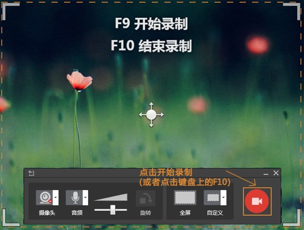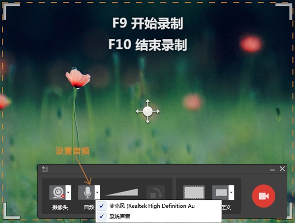 在录制之前可以设置录制的声音,音量设置的越高录制的视频的声音越大。设置完后点击开始录制(或者按键盘上的F9开始录制),结束录制时直接按键盘上的F10停止录制。
