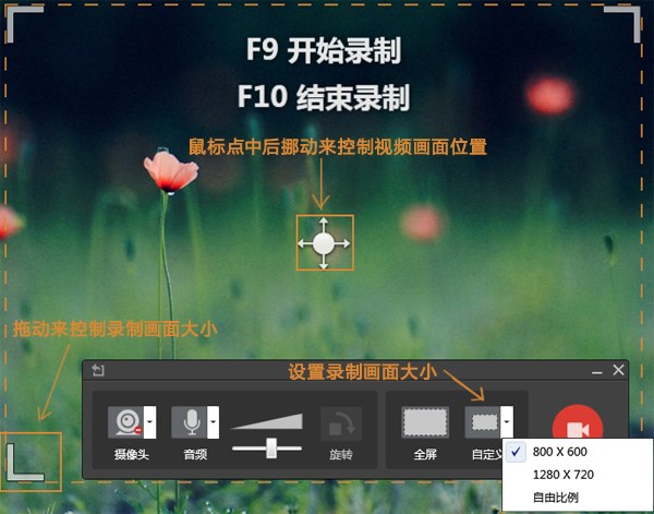 设置录制的屏幕画面的大小。如果想录制整个电脑屏幕直接点击“全屏”,如果只想录制电脑上屏幕的某一部分画面,点击“自定义—自由比例”然后拖动虚线框的四个角来划定录制区域。鼠标点击中间的“十字圆点”可以改变位置。