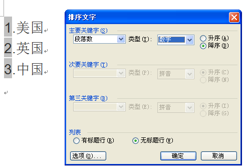 1、如果原始序列按数字序号排列(例3,中国 2,美国 1,英国)