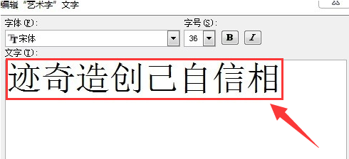 3、在编辑艺术字框中逆向输入标题文字。注意是“逆向输入”。比如标题文字是:相信自己创造奇迹。那么输入的就是:迹奇造创己自信相。完成后点击【确定】。
