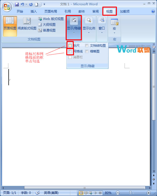 1.切换到【视图】选项卡,单击【显示/隐藏】,在弹出的下拉面板中,勾选【标尺】和【网格线】前面的选框。标尺和网格线就在文档中显示出来了。若要隐藏标尺和网格线,只需再次去掉勾选即可。