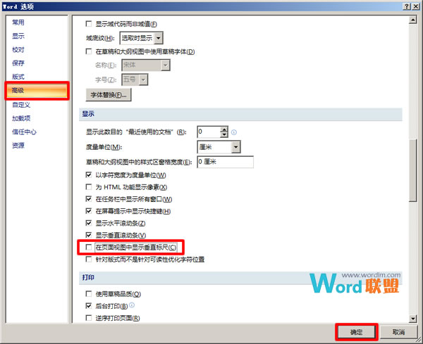 2.在弹出的对话框中,选择【高级】选项,在右侧的功能命令中,找到【显示】一栏,将其中的【在页面视图中显示垂直标尺】的勾单击取消。最后点击【确定】。