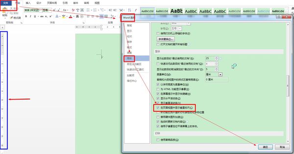 2010.2013版本:文件-选项-高级-显示-勾选在页面中显示垂直标尺-确认,步骤如下图,结果为蓝色部分: