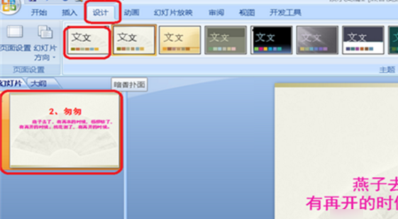 4、幻灯片的背景颜色默认的是白色的,在菜单栏中找到设计,单击一下,会出现软件提供了很多的背景样式供选择,根据爱好,单击喜欢的背景就可以了。