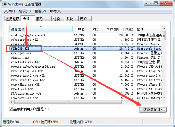 选进程,找word.exe,结束任务