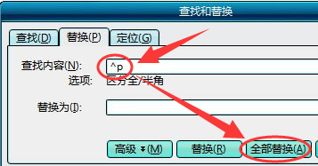 如果要替换软回车(垂直向下的箭头),在“查找内容”里面输入^l,如果是替换硬回车(向下再左转的箭头),在“查找内容”里面输入^p,“替换为”里面不输入任何字符,然后点击“全部替换”,就可以删除整个文档里面的软回车或硬回车了。