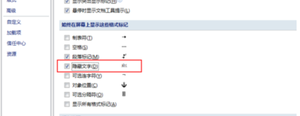 如果要求只显示隐藏文字,而不显示其他标记,可通过word选项---显示--勾选始终显示隐藏文字选项。