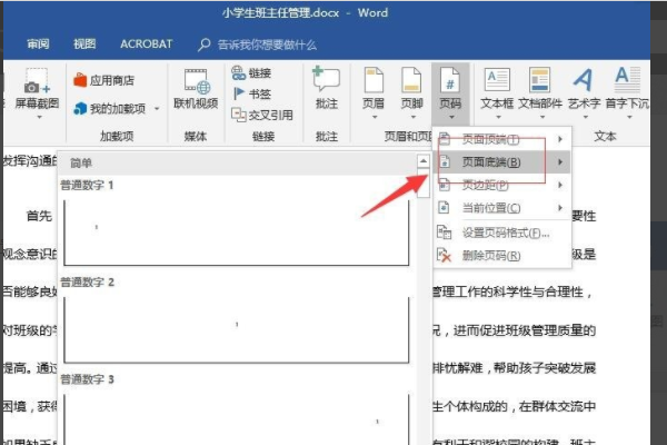 3、接着在下拉菜单中选择“页码底端”。