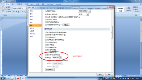 文件--选项--高级--显示文档内容,去掉“显示域代码而非域值”前的勾选;