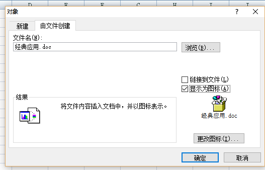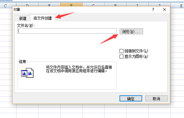 2.选择“由文件创建”选项卡,点击“浏览”找到所插入文件,并确定。