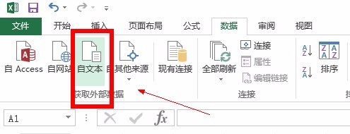 2、打开excel表格,点击“数据”选项卡,在“获取外部数据”当中,找到“自文本”。