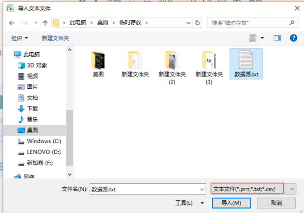 3、点击“自文本”,弹出下一窗口,选择刚才保存的名为“数据源”的txt类型文件,点击“导入”。因“自文本”方式数据导入默认的只有三种文件类型txt、csv、prn,所以需要事先将word转变为txt。
