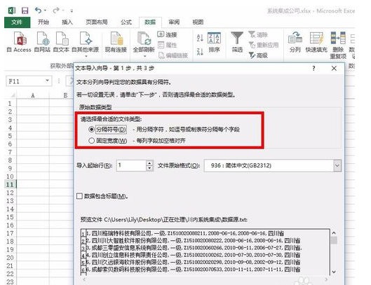4、弹出“文本导入向导”对话框。选择最适合的文件类型,方便导入后,数据以已选择方式分列。点击“下一步”。如果选的“分隔符号”,则分隔符号必须是英文状态下的符号,否则导入后无法分列。