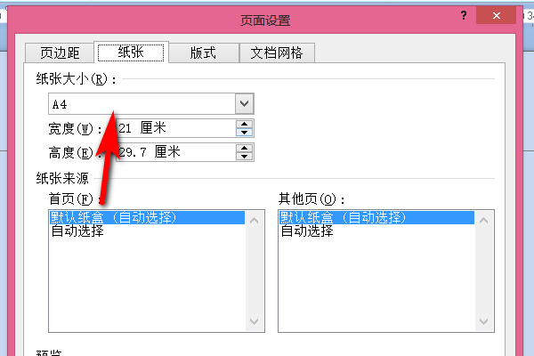 4、然后在纸张里面响纸张大小选择为A4,或是其他的纸张。