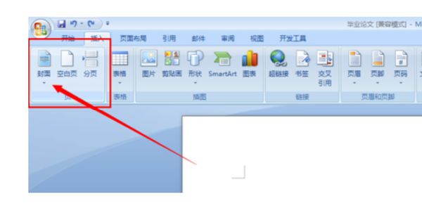 步骤二:在新建的空白Word文档编辑窗口,打开标题菜单栏的“插入”选项卡,然后再点击“页面”-->“封面”选项。如图所示;