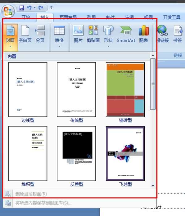 这样你的自定义图片就保存到WORD封面库里了(如下图),这样你可以随时使用了,也可以把喜欢的封面设计保存到封面库里,在需要的时候只要点击插入—封面,选择你喜欢的就可以了。
