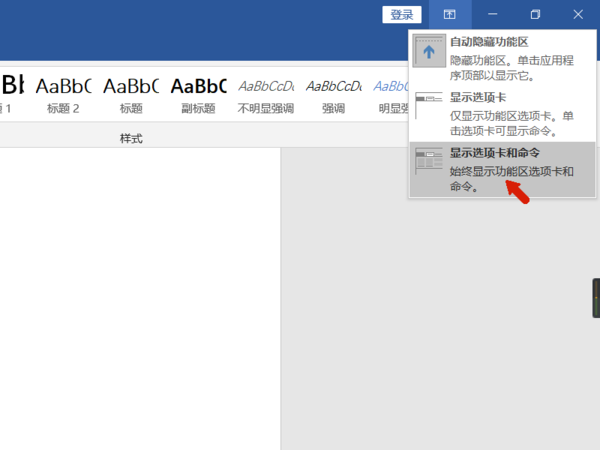 4、点击后可以看到会出现功能区的显示以及隐藏菜单,此时我们选择显示选项卡和命令。