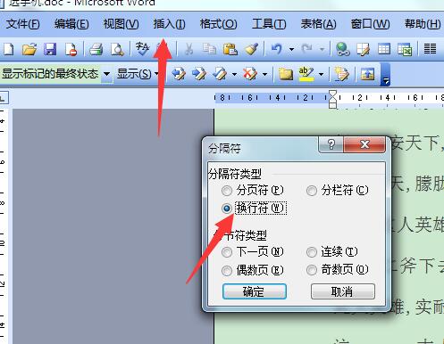 2、将光标移至如图位置,单击插入,选择“分隔符”,再选择”换行符”,点击确定。