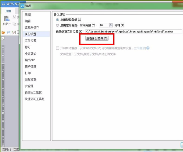 6.如果我们要找回没保存的文件,就在保存恢复文件位置里边去找,当然这里直接点击查看备份文件即可。