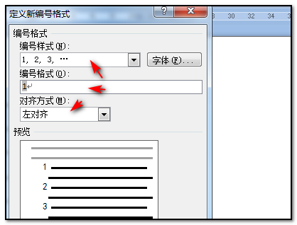 5、在弹出的对话框中,就可以根据实际情况对编号样式、格式及对齐方式进行设置;