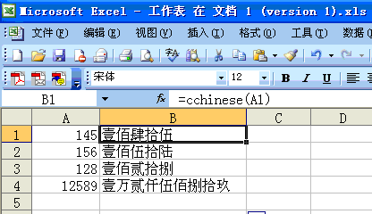回到Excel工作表中,若要转化A1单元格的数字,则可在B1单元格中输入公式=CChinese(A1)。要转化A这一列,则鼠标指向B1C1单元格交汇的的下脚,变符号之后下拉即可。