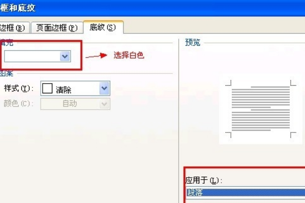 4、“填充”选择白色,“应用于”选择段落,设置完成点击“确定”。