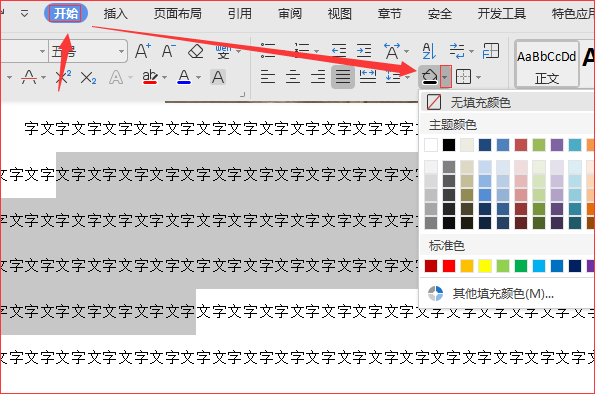 3、选中一段文字,点击“开始”按钮,接着点击“底纹颜色”右边的倒三角符号,弹出供选择的颜色面板。
