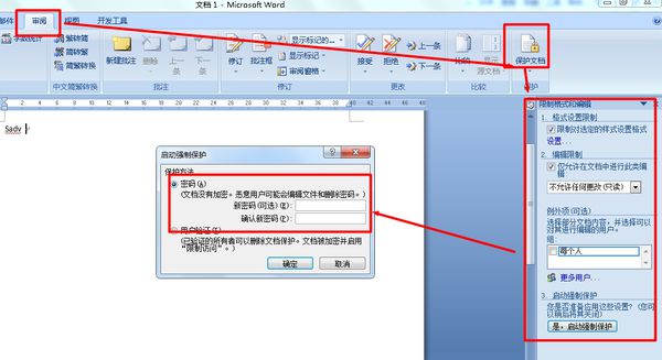 5、在打开的对话框中输入密码后点击“确定”。然后保存文档,这时候Word文档就不能选择、复制、粘贴等操作了。