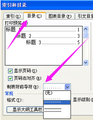 2、选择目录,选择显示页码、页码右对齐;在制表符前导符中选择一种,确认后查看即可完成页码数字格式一致了。