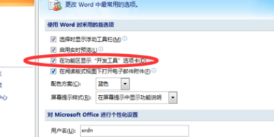 1、首先我们打开word文档,在功能区最上面可以找到一个开发工具选项,如果最上面没有的话,就找文件,word选项,在word选项对话框常用里有一个,在功能区显示开发工具选项卡,我们在前面勾选上就可以了。