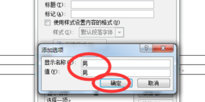 6、在出来的添加内容对话框中输入自己要设置的下拉菜单内容,这里就以性别的男女为例了,输入完成之后点击确定就可以。