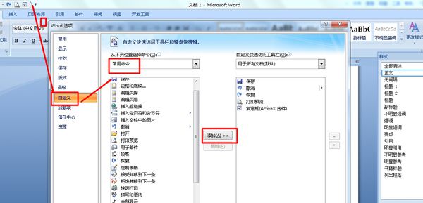 2.在打开的“Word选项”对话框中切换到“快速访问工具栏”选项卡,然后在“从下列位置选择命令”列表中单击需要添加的命令,并单击“添加”按钮即可,