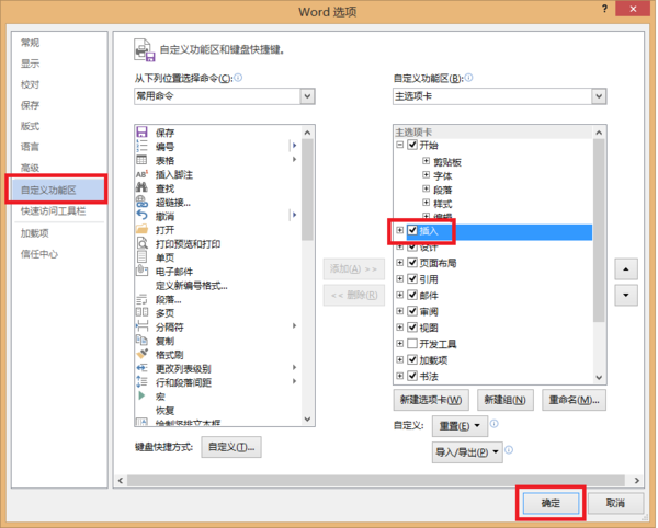 word选项里面,点击 自定义功能区 ,然后勾选 插入 ,确定即可。