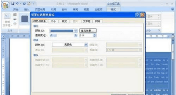 4、在“文本框样式”一栏,可对文本框填充颜色、外观颜色进行调整。还可单击下拉小箭头,弹出“设置自选图形格式”对话框,可以设置大小、版式等等。