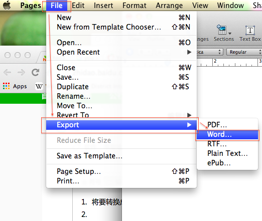2、然后点击屏幕顶部的菜单栏的文件,选择导出为—>Word