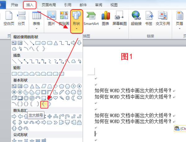 1、如图1,在word文档中选择“插入”,再选择“形状”中的“左大括号”,然后在文档中合适位置,画出如图2所示大括号。