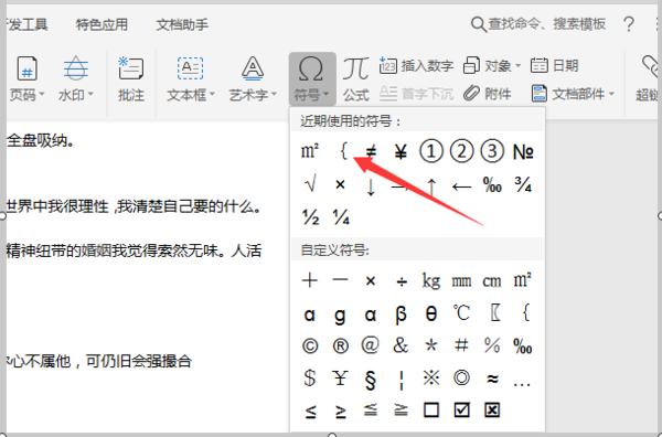 4、在插入菜单中点击右侧的符号选项,并点击符号下拉选项中的大括号图标,这样就能在需要的位置输入大括号。