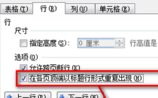 3、然后我们在【表格属性】的【行】选项卡中,勾选【在各页顶端以标题行形式重复出现】。