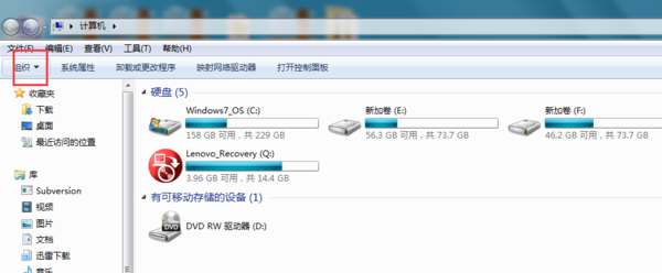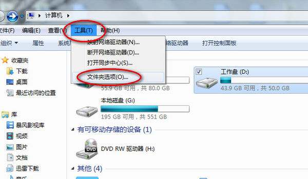 第一步:点击“我的电脑”进入如下图界面。之后选择“组织”下拉条中的“文件夹选项”。