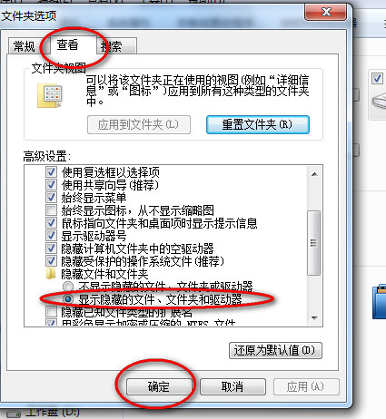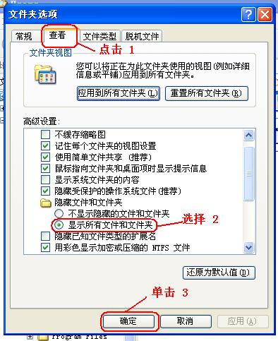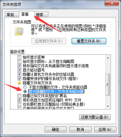 3.在打开的“文件夹选项”对话框中点击“查看”选项卡,并拖动滚动条至”显示所有文件和文件夹“,如下图