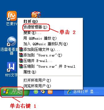 1、在屏幕右下角的“开始”处单击鼠标右键,在弹出菜单中点击“资源管理器”