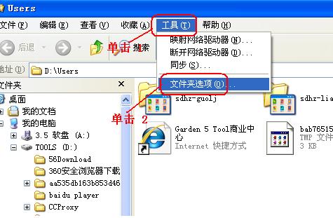 2.在我的电脑窗口中,点击"工具"菜单下的“文件夹选项”,如下图;