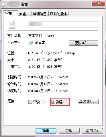 设置隐藏:在文件上单击右键,选择属性,勾选隐藏然后点击确定即可。