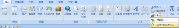 1、单击插入选项卡上对象---->文件中的文本命令,如图所示;