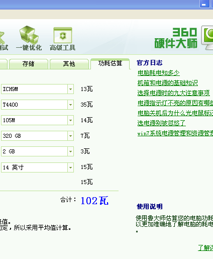 鲁大师,现在的360硬件大师里有个估算功率的功能。。。能检测你的电脑的功率。